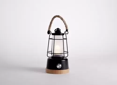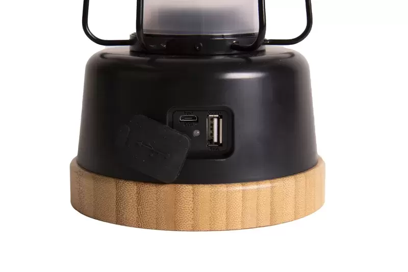 Linterna de camping con batería recargable. Regulable y con funcionamiento en modo de llama parpadeante o en modo de faro intermitente. Fabricada con materiales de alta calidad, luz de bambú y acero inoxidable.