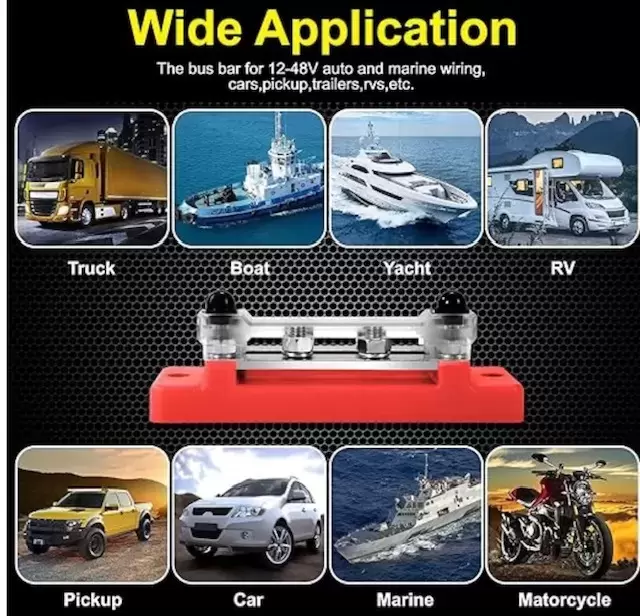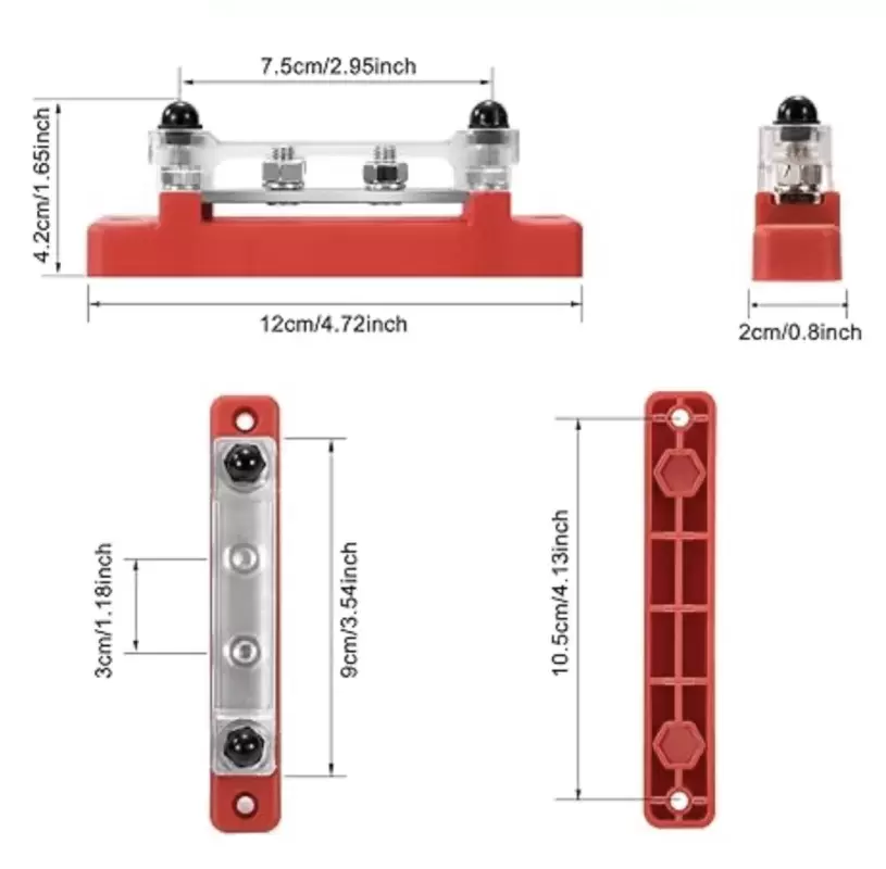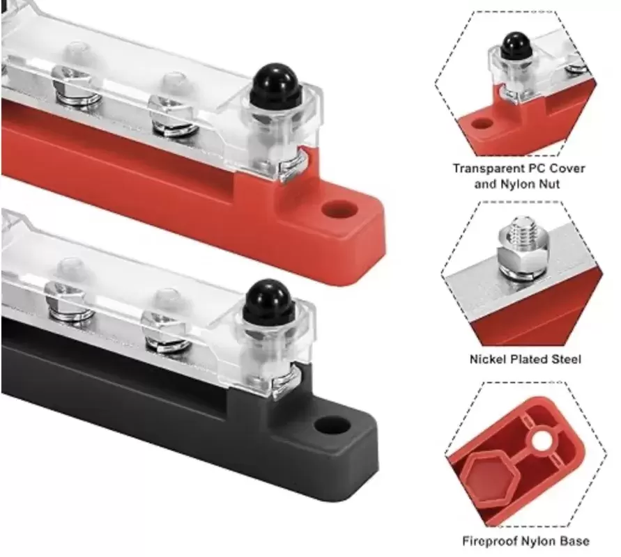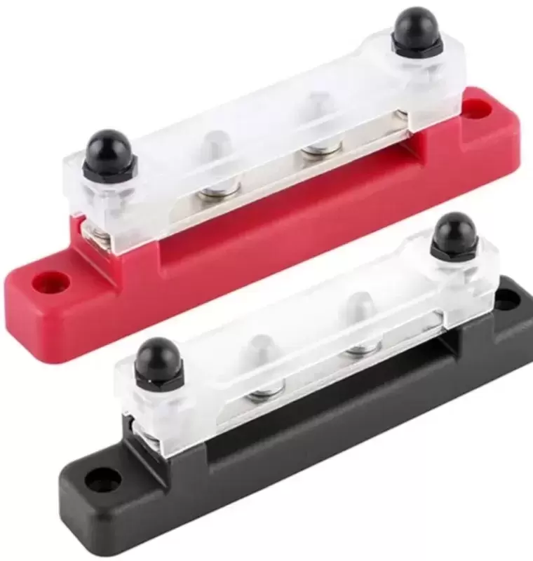 Barre NOIRE avec 4 connexions Busbar 150AH NÉGATIF plus couverture pour installations dans camping-cars et caravanes.