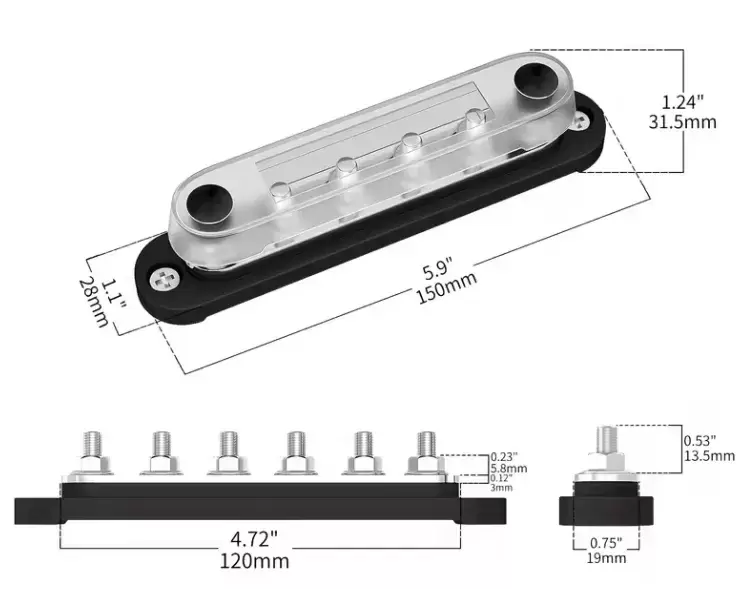 Cada barra colectora de 12v cuenta con 6 pernos de terminal M6 (1/4") y puede soportar un voltaje máximo de 300V CA y 48V CC, con calificaciones de amperaje continuo de hasta 130A CA y 150A CC.