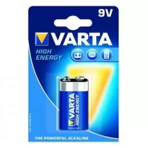 Blister de 1 pile alcaline de la marque Varta, modèle High Energy du type 9V 6LR61 dont l'utilisation est courante dans les appareils à forte consommation comme les jouets, les radios, les détecteurs de fumée...