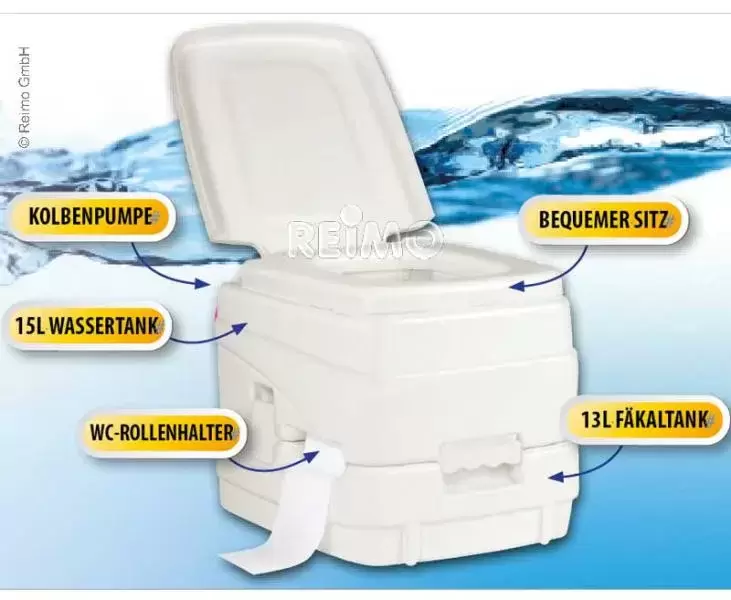 Hygiène parfaite. Toilettes chimiques portables faciles à utiliser et de la plus haute qualité. Taille compacte pour rester techniquement sophistiqué et facile à nettoyer. Il est composé de deux parties, la partie supérieure avec le siège, le couvercle et le réservoir d'eau propre (15 litres) et la partie inférieure avec le réservoir d'eaux usées (10 litres) et le dispositif de fermeture. les parties supérieure et inférieure sont reliées par un fermoir en plastique. La partie inférieure est munie d'une poignée robuste et peut être fermée hermétiquement, transportant et éliminant ainsi les eaux usées de manière pratique. Le siège de toilette antibactérien empêche la formation de champignons et de bactéries, une pompe à main solide et pratique avec un grand volume de chasse de 15 litres d'eau suffit pour environ 125 chasses d'eau, soupape d'aération , Tous les composants sont en plastique design de haute qualité Base très robuste et hermétique pour un transport pratique vers le lieu de vidange.
