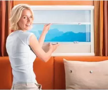 Ensemble de cassettes avec moustiquaire et store pouvant être fixés à l'intérieur des fenêtres des caravanes ou des camping-cars qui n'en disposent pas, avec des guides pour faire glisser les feuilles avec des crochets et des fermetures résistantes.