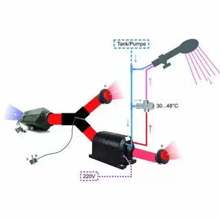 Lorsqu'il est entièrement chauffé (électriquement à environ 70°C, par l'air à la température du flux d'air), deux à trois fois la quantité d'eau peut être éliminée en ajoutant de l'eau froide.