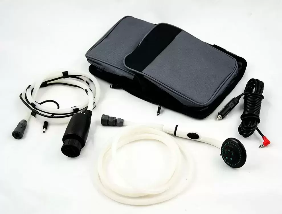 : Mallette de transport, tuyau et pompe à eau, adaptateur 12 volts, pommeau de douche.