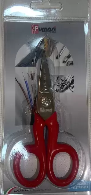 Ciseaux d'électricien Fumasi à lame droite et manche en métal recouvert de plastique.