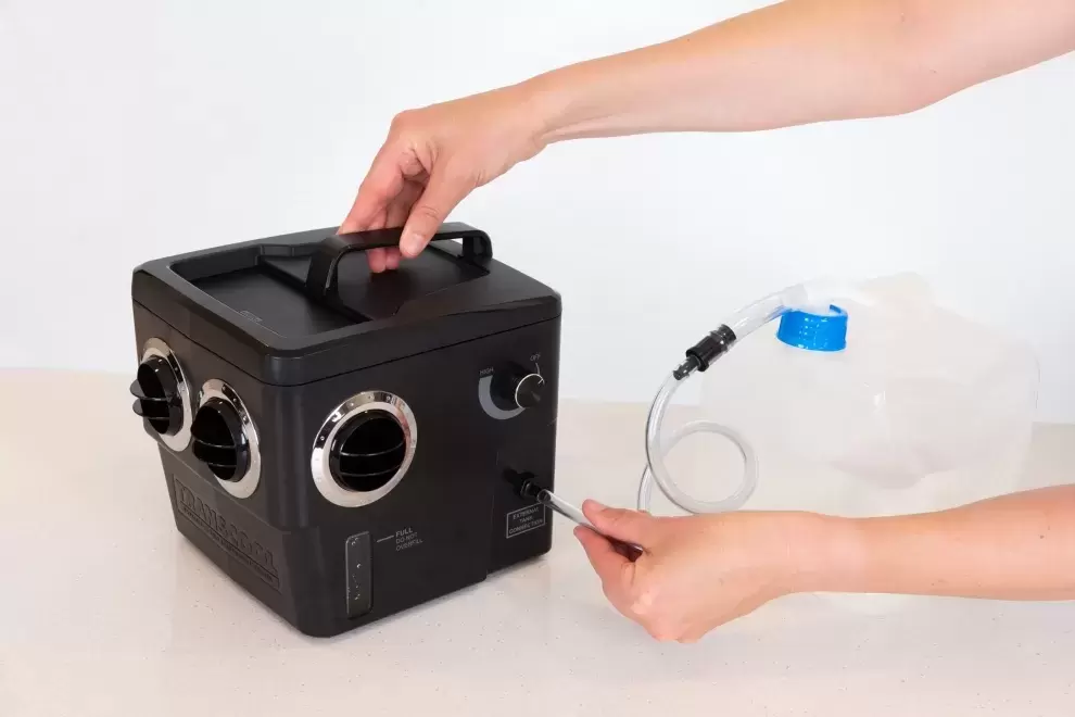 Le refroidisseur évaporatif portable Transcool est robuste, léger, compact et consomme peu d'énergie.