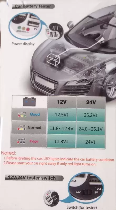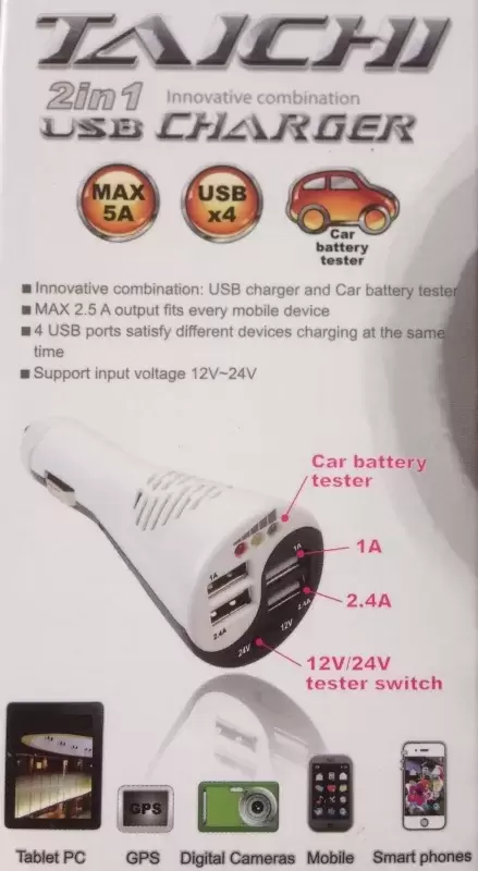 Connecteur allume-cigare avec quatre sorties USB + test de batterie, adapté à la fois au 12 et au 24 volts, fusible de protection intégré et capacité maximale de 5ah.