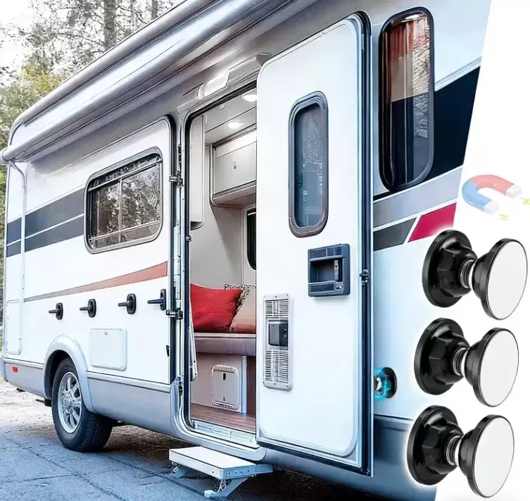Dispositif de retenue de porte rond noir avec boule magnétique pour caravanes, camping-cars et fourgons aménagés.