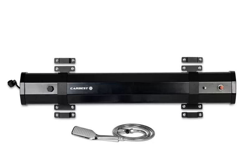 - Cette douche d'extérieur de haute qualité, fabriquée en PVC alimentaire, offre une capacité de 20 litres et garantit une douche rafraîchissante en plein air. Elle peut être utilisée avec un compresseur ou une pompe à vélo et se remplit avec un tuyau d'arrosage standard. Son élégant pommeau chromé et son tuyau de 1,5 mètre offrent un confort optimal. Le support conique avec patin adhésif assure une fixation sûre. Grâce au kit de montage universel inclus, la douche s'installe sur pratiquement toutes les barres de toit, idéales pour le camping et les voyages. Elle est équipée d'une valve à dégagement rapide pour une utilisation facile. Dimensions : 113 x 18 x 14,5 cm, kit de montage universel inclus.
