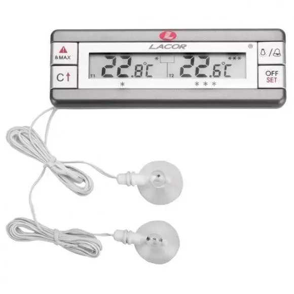 Il indique la température du réfrigérateur et du congélateur, pour cela nous n'aurons qu'à coller l'une des ventouses sur la paroi intérieure du réfrigérateur et l'autre sur la paroi intérieure du congélateur, et placer l'écran où nous sommes intéressé.