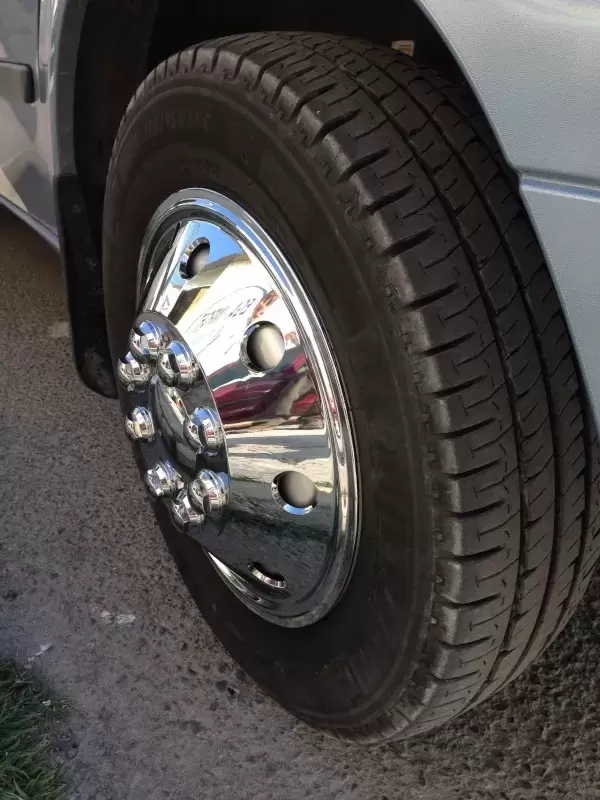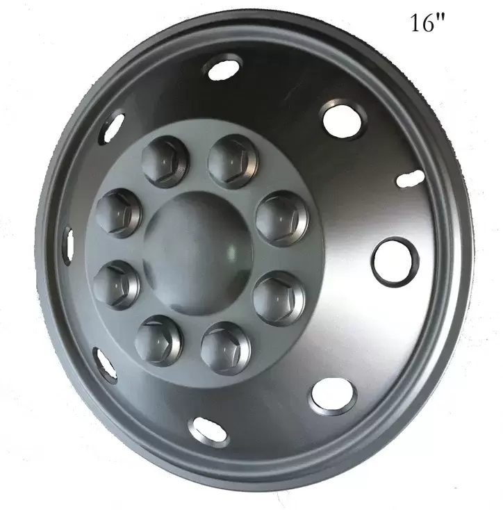 Quatre enjoliveurs de camping-car 16", construction en plastique robuste avec finition couleur aluminium.