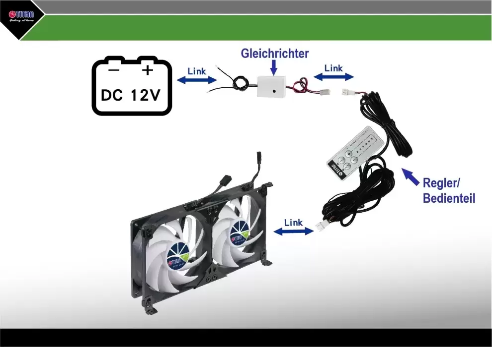 vous devez d'abord connecter le double ventilateur AVANT L'INSTALLATION et tester si les ventilateurs tournent et aussi pour que vous puissiez observer dans quelle direction le flux d'air est soufflé ou l'air est aspiré.