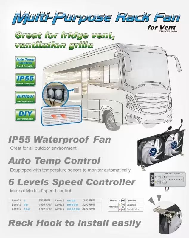 Kit deux ventilateurs de réfrigérateur TITAN de 12 cm avec redresseur intégré pour caravanes, camping-cars et camping-car. - Réf.TTC-SC22(B)+