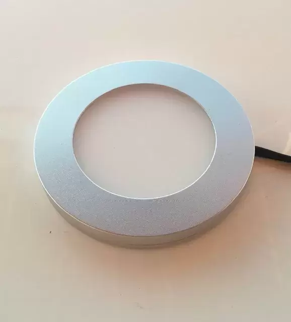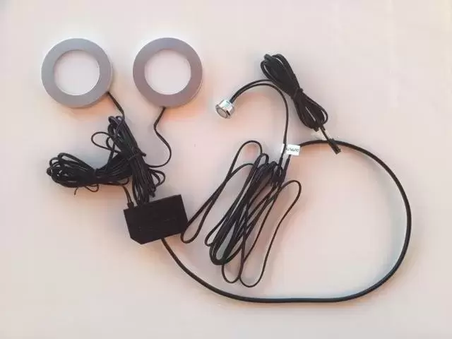 2 lampes led 2.7w 12v 6000K mesurant 7.1cm extérieur et 8mm de hauteur pour installation en surface et câble de 2 mètres.