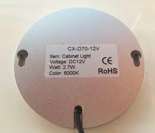 4 2.7w 12v led light 6000K mesurant 7.1cm extérieur et 8mm de hauteur pour installation en surface et câble de 2 mètres.