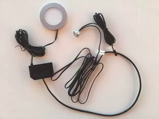 1 lumière led 2.7w 12v 6000K mesurant 7.1cm extérieur et 8mm de hauteur pour installation en surface et câble de 2 mètres.