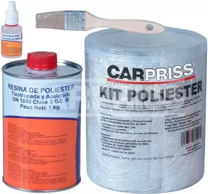 Kit de résine polyester orthophtalique, accélérée et thixotrope avec la bonne viscosité à appliquer au pinceau. Kit composé de : résine, peroxyde et MAT.