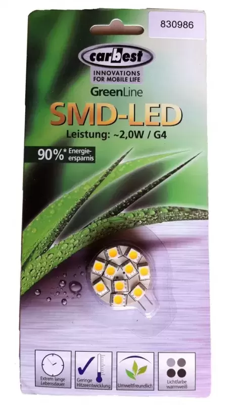 Lampe led de haute qualité G4 connexion latérale, 10 led xSMD, 1.6W, 10-30V, 81lumen , angle de faisceau 120º. , 30 mm de diamètre et 4 mm d'épaisseur.