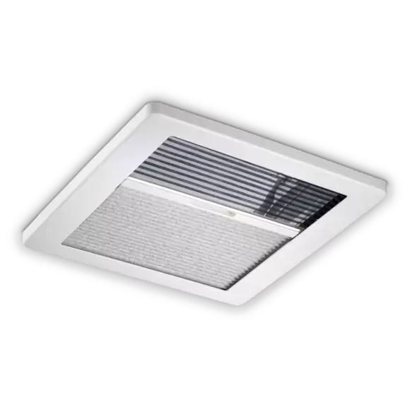 Puits de lumière Dometic Mini Heki Style avec couvercle transparent, fermeture à plusieurs positions d'ouverture, plafonnier intérieur avec store et moustiquaire.