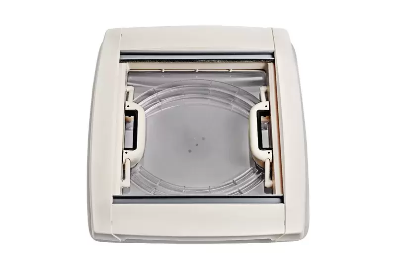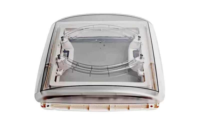 Lanterneau transparent 40x40 pour caravane ou camping-car avec stores et moustiquaire au plafond blanc.