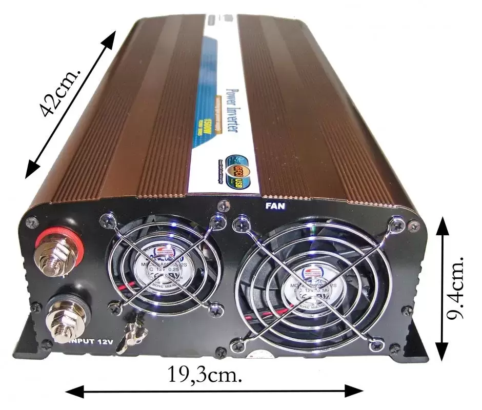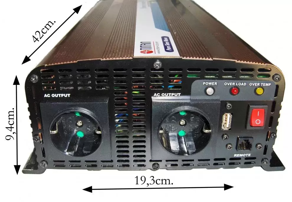 Onduleur onde pure 1500W de puissance continue et 3000W en démarrage de marque TITAN, fabrication de haute qualité en aluminium anodisé série or, télécommande et câbles inclus, protégé par un fusible, deux sorties 220V et ventilé.