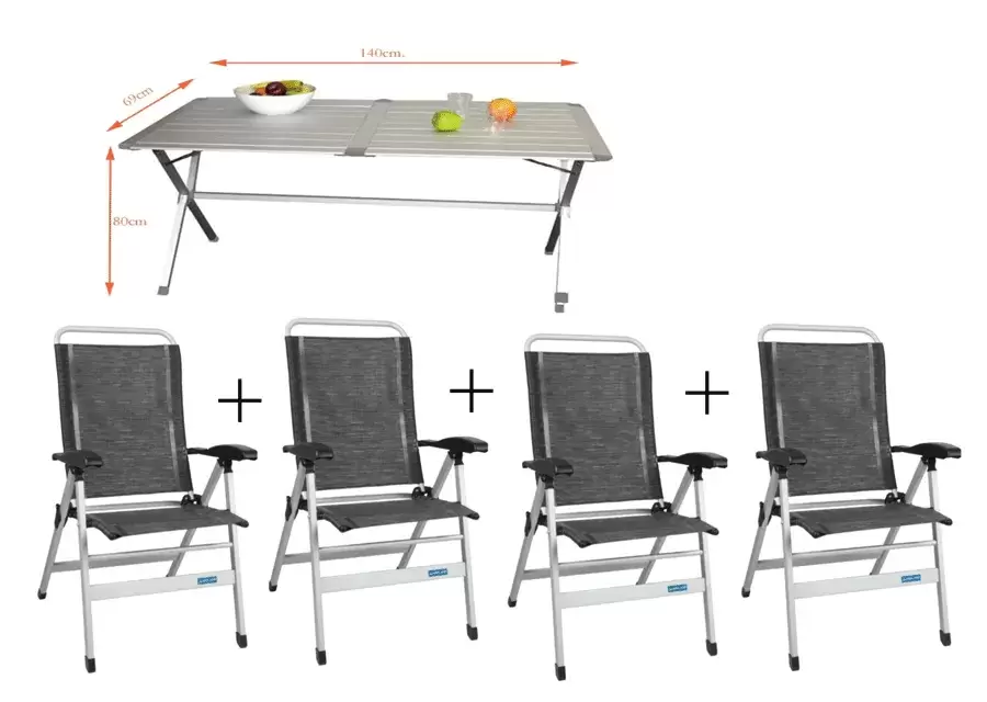 Ensemble de table en aluminium amovible (très compacte une fois démontée et pliée) plus quatre chaises à dossier haut avec une structure en aluminium.