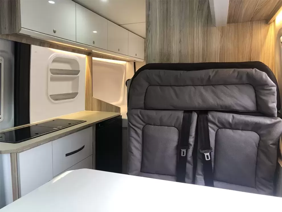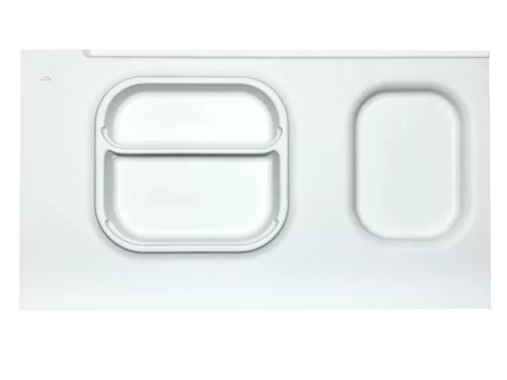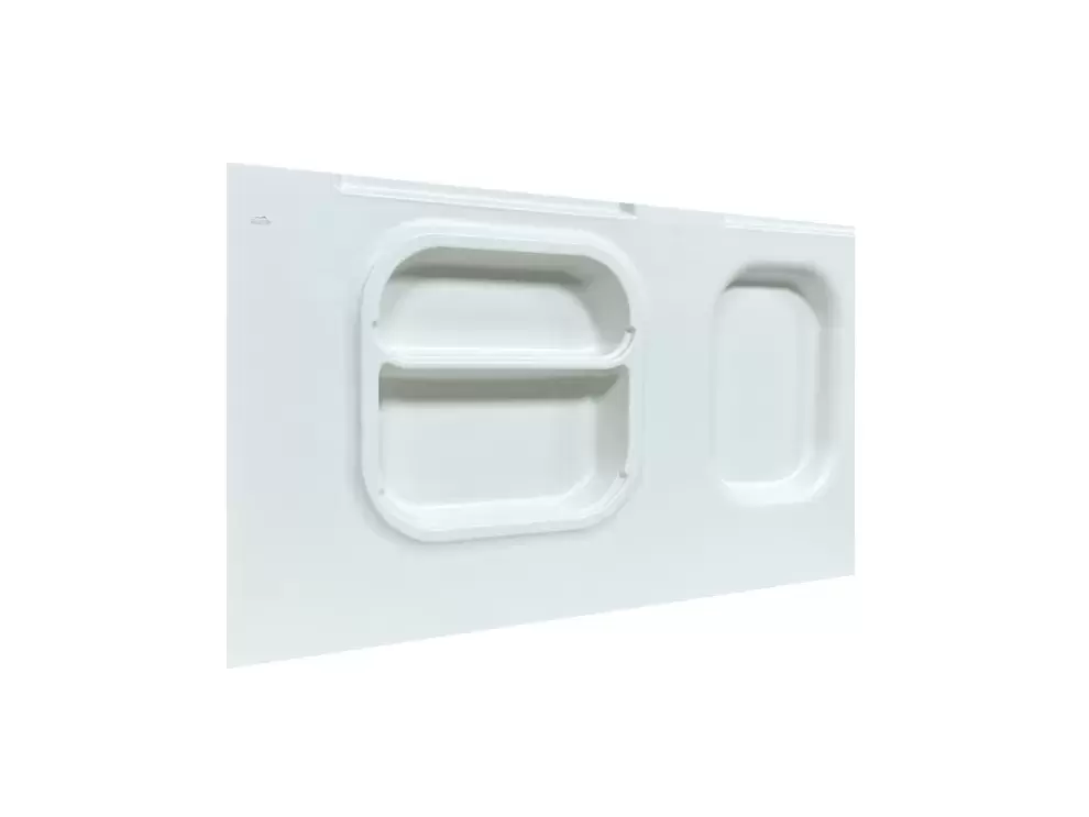 El panel no incluye las paredes frontales de los estantes que se muestran en la autocaravana terminada. El panel cuenta con un canal especial donde el cliente puede colocar el panel de su mueble del mismo color que los muebles de la caravana para un acabado más atractivo.