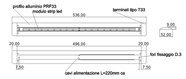Dimensions 536 mm de longueur x 52 mm de largeur x 9 mm de profondeur
