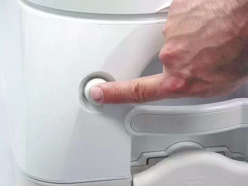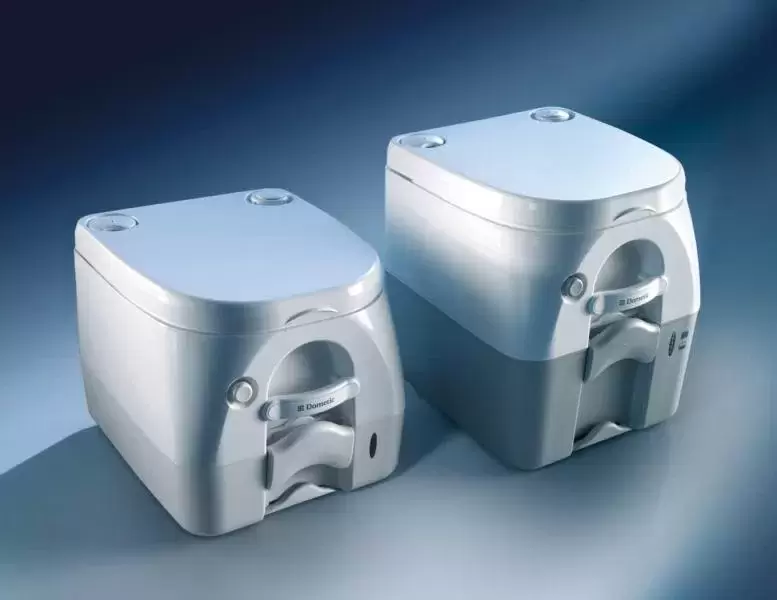 Toilette portable pour le camping 972 Dometic. par un simple bouton-poussoir, une efficacité de pompage accrue grâce à une forte pression de rinçage, jusqu'à 27 rinçages avec un seul remplissage, une vidange sans éclaboussures, une protection anti-débordement sur un petit volume d'eau douce / 8,7 l et un volume d'eau usée supérieur à 9,8 L et est composé de ABS et belle finition brillante.
