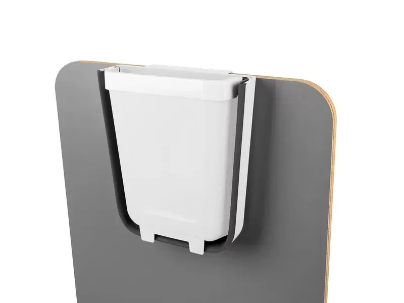Vous accrochez la poubelle dans un placard ou un tiroir. Par exemple, la cuisine : accrochez la corbeille dans le meuble de cuisine et glissez tous les déchets du comptoir vers la corbeille.