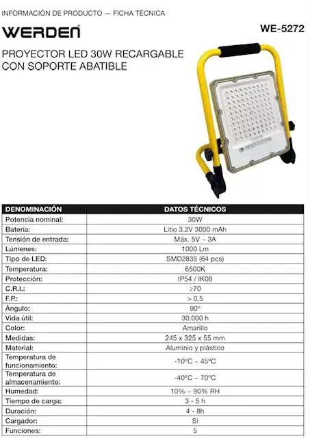 Projecteur Led rechargeable 30W avec batterie Lithium LiFePO4 3,2V, support pliable, polyvalent, camping, caravaning et 4x4 terrestre.