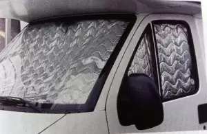 Stores thermiques pour camping-cars équipés d'une tête Ford Transit avant l'an 86, le kit contient les protections pour les deux vitres et pour le pare-brise, un sac de transport et des ventouses.