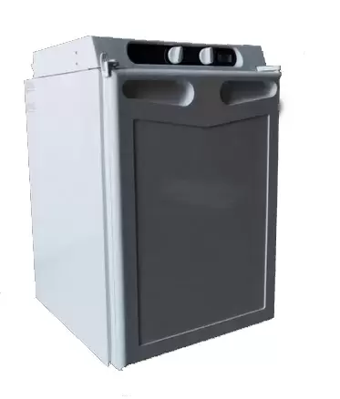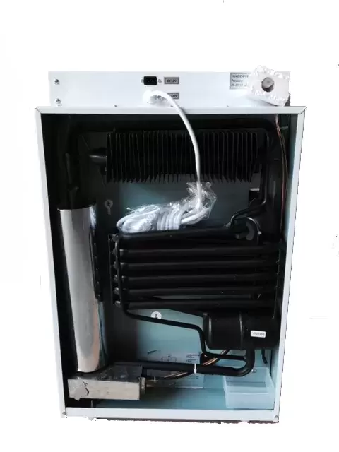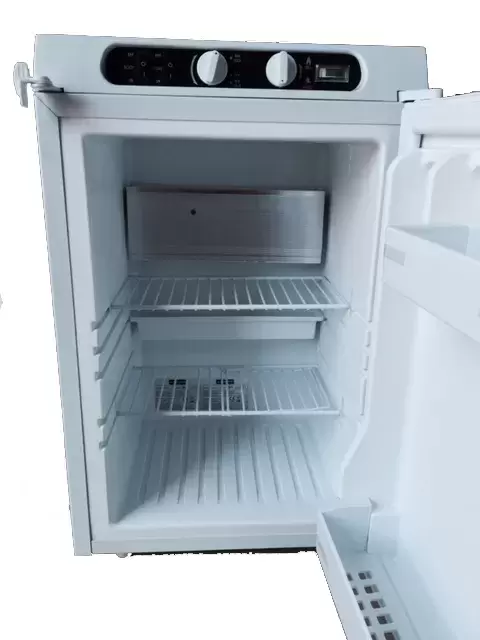 Fonctionnement tri-mix : 12/220 V et gaz. Avec thermostat et indicateur de présence de flamme. Système de verrouillage de la porte et du bac à glaçons. Câble de connexion avec prise allume-cigare (150 cm). Le modèle n'est pas recommandé pour l'installation.