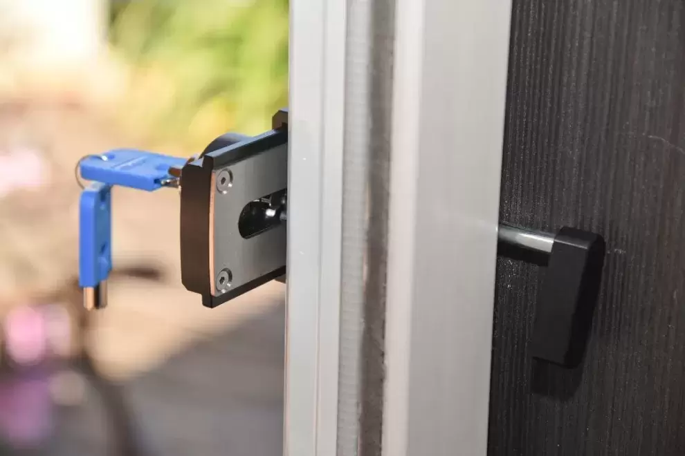Serrure pour la porte de la maison, de haute qualité, construite en aluminium usiné et anodisé de COULEUR NOIRE avec cylindre de serrure en acier, système de fermeture coulissant, elle peut également être fermée de l'intérieur de la maison sans utiliser de clé, offrant une sécurité supplémentaire et ouverte sans utiliser de clé de l'intérieur en cas d'urgence.