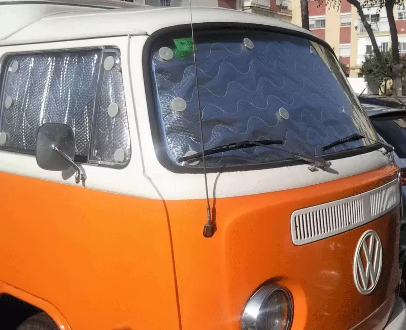 Ensemble de stores thermiques pour VW T2 composé d'une face avant pour le pare-brise, de deux panneaux pour les vitres et de ventouses à fixer sur la vitre.