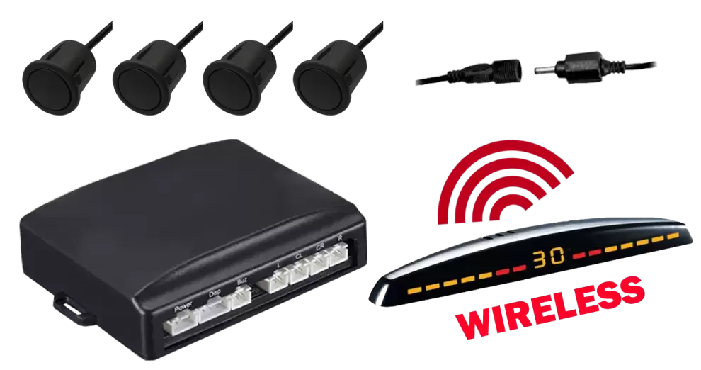 Système de stationnement avant arrière avec 4 capteurs avec affichage radiofréquence (sans fil) de haute qualité. Il n'est pas nécessaire de faire passer des câbles de l'écran à l'unité de commande. HAUT DE GAMME.
