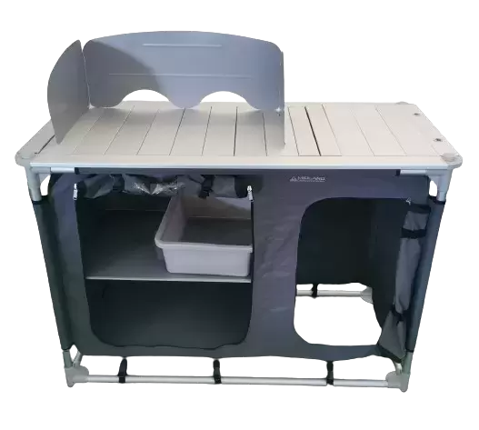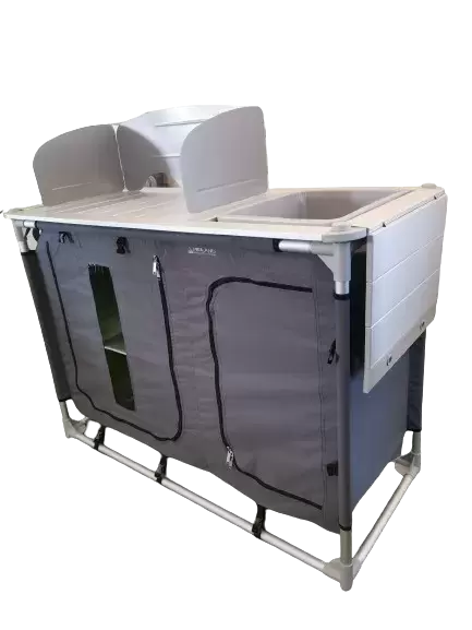 Barres de liaison en aluminium et profilés d'angle en plastique, pieds réglables, étagères avec bord en aluminium, espace spécial pour la bouteille de gaz.