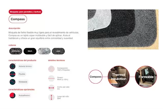 Moquette en feutre souple très légère, c'est un tissu super moulable et facile à appliquer, elle isole l'habitacle et offre un bel équilibre entre confort et douceur.