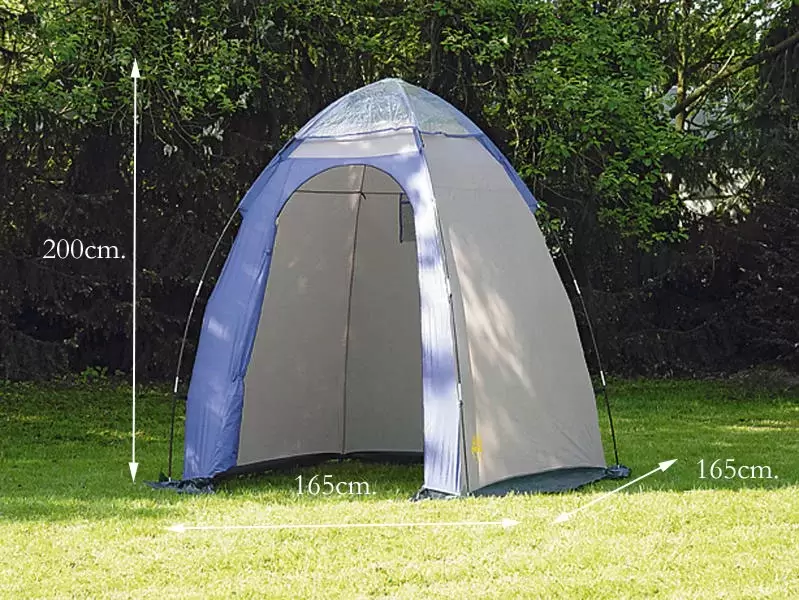 Tente de cuisine à usages multiples : comme douche, salle de bain, rangement, etc., montage facile et rapide, ventilation en partie haute, filet de rangement sur la paroi arrière, structure tige en fibre de verre 9,5 mm.