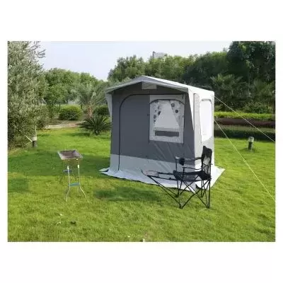 Cuisine séparée, espace de rangement pour camping. Moustiquaires + stores. Surface au sol : 200 x 150 cm.